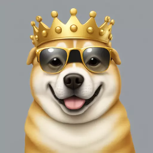 protrait side view of a cute fat doge with golden crown and sunglasses emoji